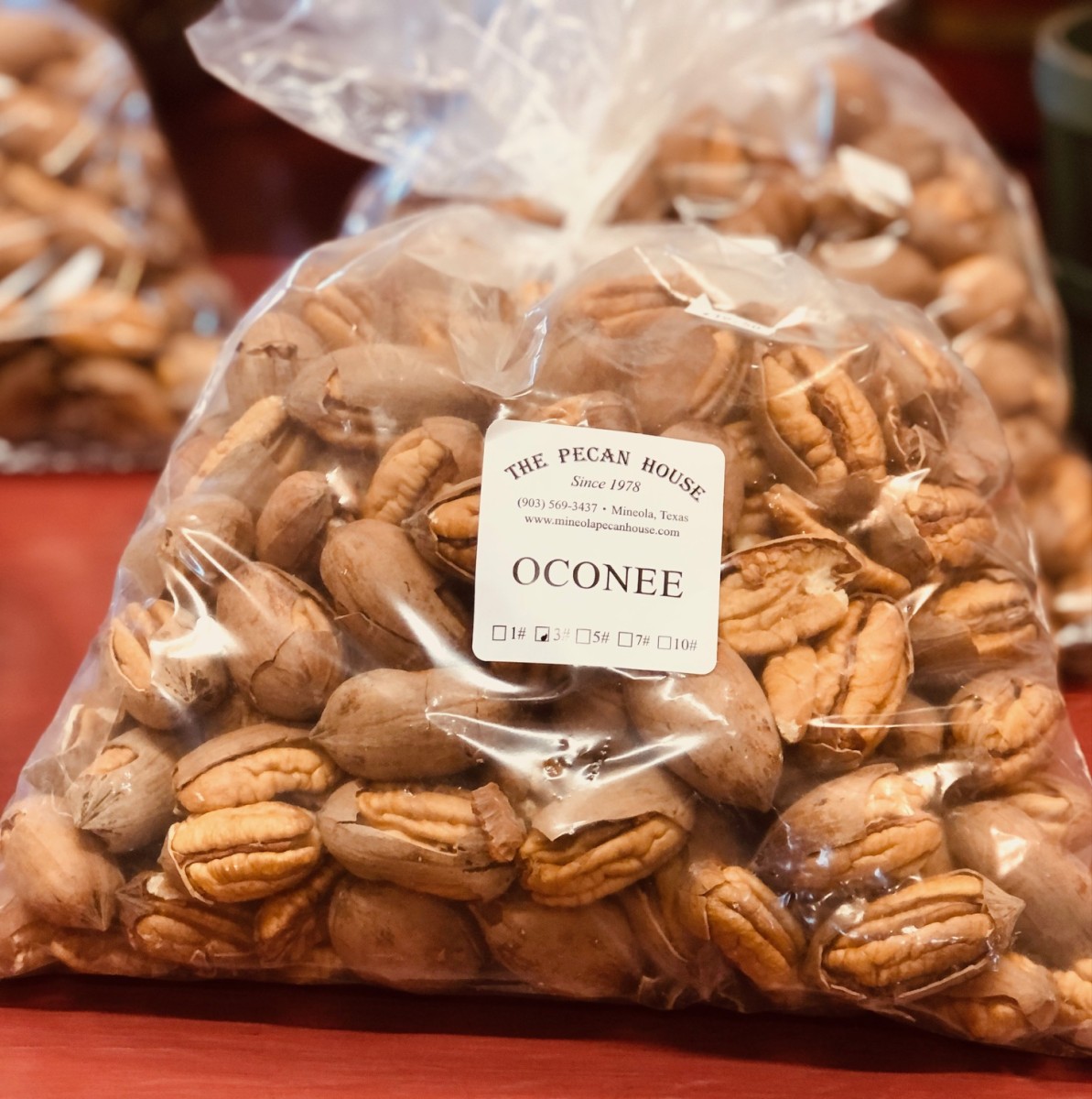 Oconee pecans are a large pecan that shells out beautifully. Pecans have been cracked $6 per pound Premium pecans have been cracked and 85% of shell blown off $8.50 per pound
